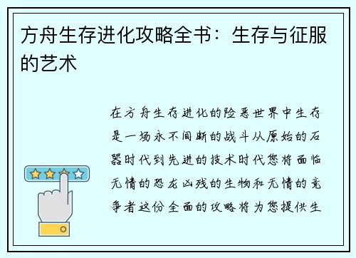 在方舟生存进化的险恶世界中,生存是一场永不间断的战斗。从原始的石器时代到先进的技术时代,您将面临无情的恐龙、凶残的生物和无情的竞争者。这份全面的攻略将为您提供生存所需的知识,掌握征服这片荒野的艺术。